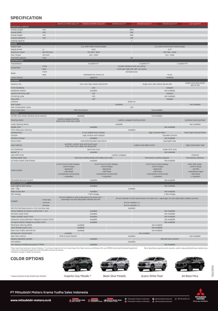 Tinggalkan Komentar / Blog / Oleh Mitsubishi Sales PAJERO SPORT | LIVE THE ADVENTURETERSEDIA 6 TYPE :DAKAR ULTIMATE (4X4) ATDAKAR ULTIMATE (4X2) ATDAKAR (4X2) ATEXCEED (4X2) ATEXCEED (4X2) MTGLX (4X4) MT